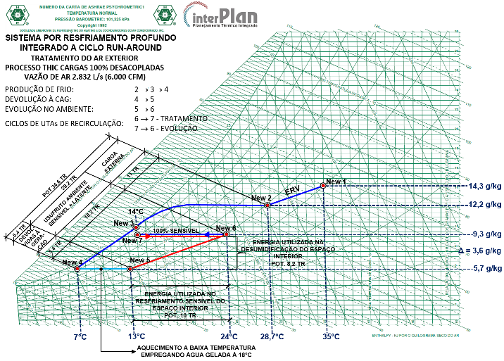 O ar,a temperatura de bulbo seco 7°C, transforma-se no fluido que resfria, e a água,a temperatura de 18°C, no fluido a ser resfriado. Sistemas triviais com água a7°C e retorno a12,5°C não teriam essa visibilidade de operação integrada em cascata. Tampouco o sistema com refrigeração híbrida, pois, ao fazer uso do processo dessecante para desumidificar entrega, como subproduto, aquecimento, diferentemente das UTAEsque desumidificam concomitantemente com resfriamento, com COP termodinâmico combinado de 6.