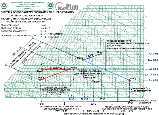 A inclusão do processo dessecante não altera a potência desenvolvida pelo conjunto, uma vez que se trata de uma transformação isentálpica, apenas altera a composição sensível/latente da potência, transformando-a de 75%/25% para 25%/75%, com participação zero na carga térmica sensível interna e potência 9 TR para desumidificação do espaço interior. O restante da potência é utilizado no complemento do tratamento psicrométrico do ar até a neutralidade para 24°C e 50% UR.