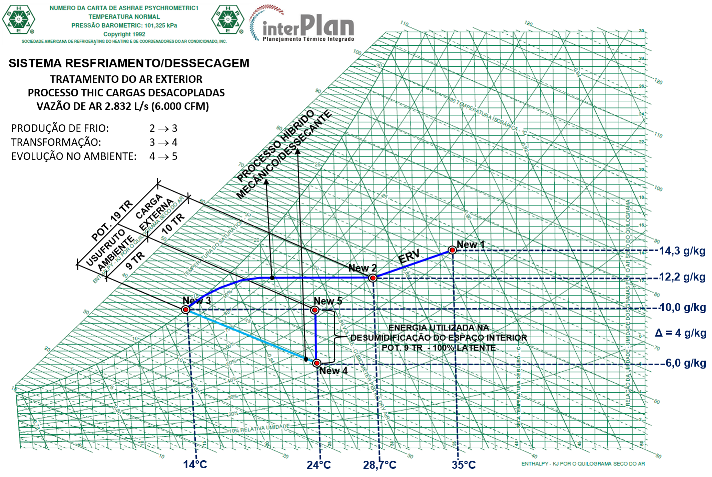 O sistema híbrido recebe o fluxo de ar externo previamente tratado em processo ERV constituído por rotor dessecante passivo em contrafluxo com ar de expurgo a24°C e 50% UR, o mesmo ocorrendo em relação ao sistema que classifica como tradicional de resfriamento/reaquecimento.À saída do estágio por refrigeração mecânica, o ar está sob condições psicrométricas TBS = 14°Ce RU 10 g/kg. A evolução no estágio dessecante ocorre sob entalpia constante – desumidificação contra aquecimento – para cada2,5°C de acréscimo na temperatura de bulbo seco, ocorre decréscimo de 1 g/kg na relação de umidade.Assim, para a considerada neutralidade da temperatura em relação à do ambiente interior (24°C), há uma disponibilidade para aquecimento de 10°C, o que resulta em uma capacidade de desumidificação de 4 g/kg e, como decorrência, 24°C e 6 g/kg na insuflação do ar tratado na unidade DOAS/ERV por refrigeração hibrida com reativação pelo arrefecimento da condensação do processo mecânico.